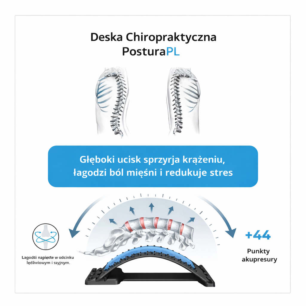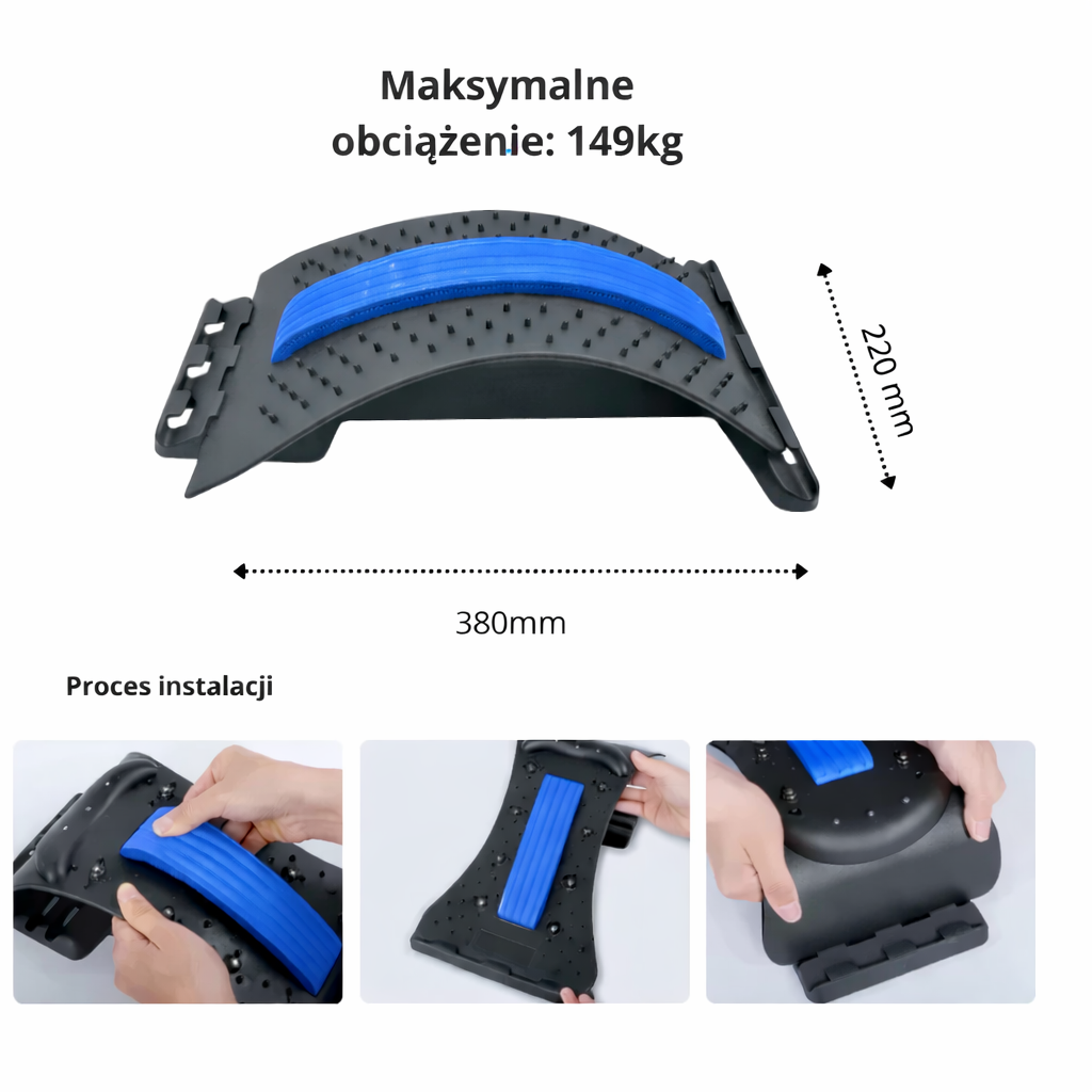 To funkcjonalne urządzenie wyposażone w ponad 44 punkty akupresury, które pobudzają krążenie, pomagają rozluźnić spięte mięśnie i zwiększają elastyczność pleców. Specjalnie wyprofilowana konstrukcja wspiera prawidłowe ułożenie kręgosłupa, redukuje sztywność oraz pomaga zapobiegać przeciążeniom. Dodatkowo zapewnia przyjemny masaż, który zmniejsza ból i napięcie po całym dniu.